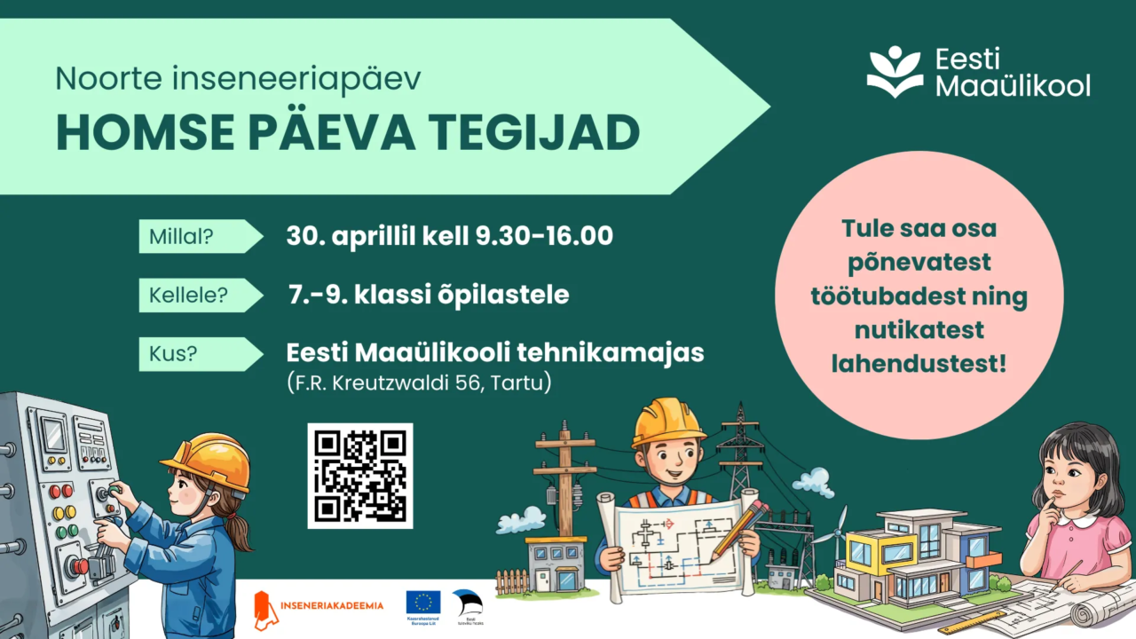 30. aprillil 2026 kell 9.30 – 16.00 toimub Eesti Maaülikooli tehnikamajas (F.R. Kreutzwaldi 56, Tartu) 7.-9. klassidele mõeldud TASUTA inseneeriapäev “Homse päeva tegijad”.